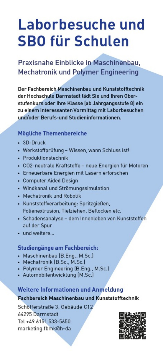 Der Fachbereich Maschinenbau und Kunststofftechnik der Hochschule Darmstadt lädt Sie und Ihren Oberstufenkurs oder Ihre Klasse (ab Klassenstufe 8) ein, einen interessanten Vormittag mit Laborbesuchen und/oder Berufs- und Studieninformationen im Bereich Ingenieurwesen bei uns zu verbringen.